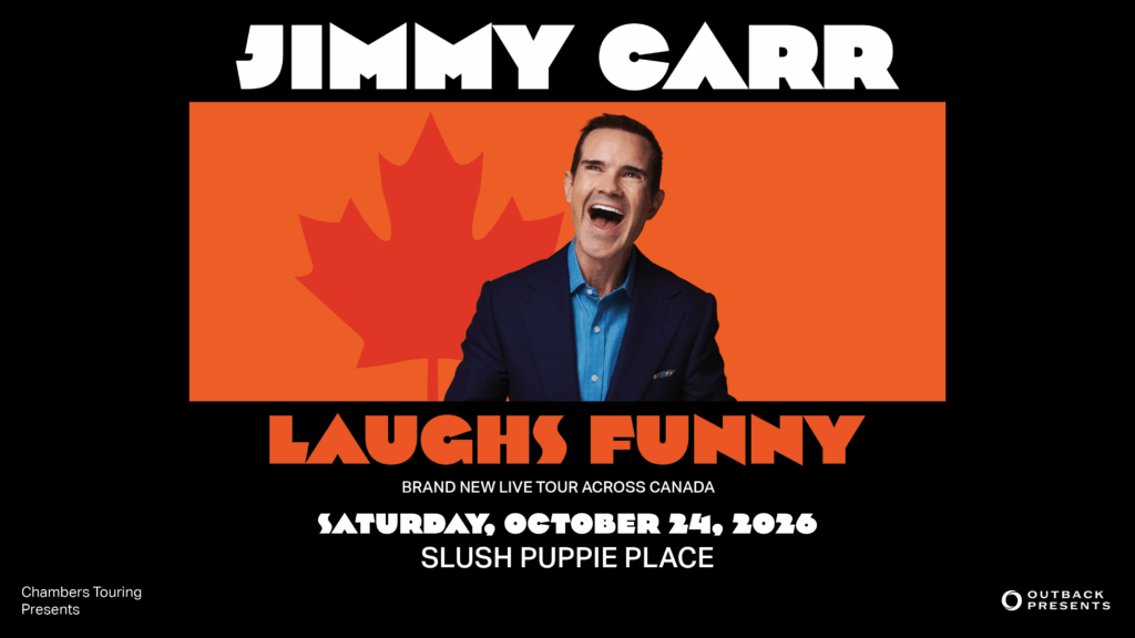 Global comedy superstar Jimmy Carr returns to Canada with his biggest tour yet, and Kingston is on the list. His brand-new show, Jimmy Carr: Laughs Funny, will make its Kingston stop at Slush Puppie Place on Saturday, October 24, 2026, as part of a massive 31-city run across the country.