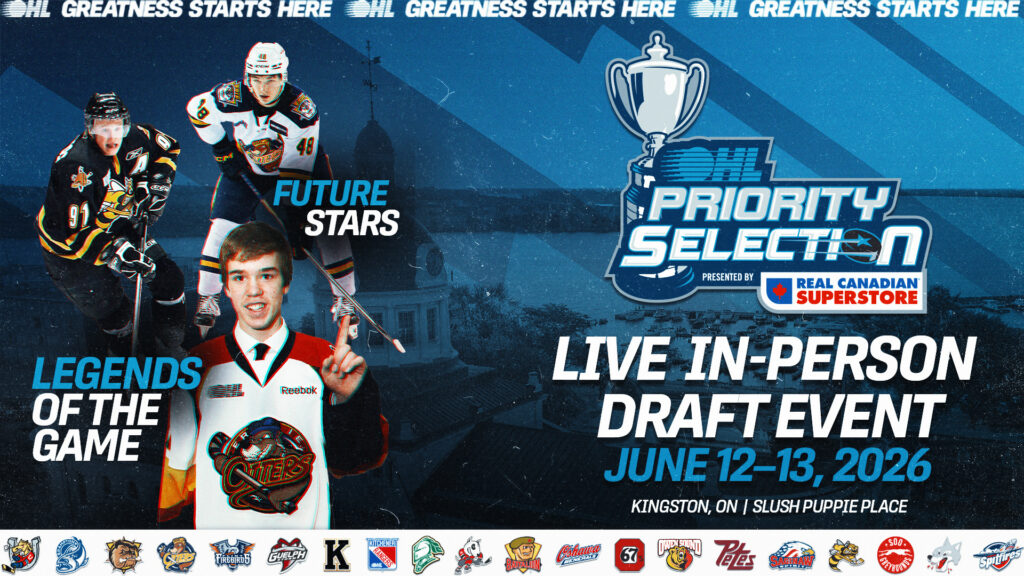 The OHL Priority Selection returns to an in-person experience for the first time in 25 years, taking place June 12–13, 2026 at Slush Puppie Place in Kingston, home of the Kingston Frontenacs.